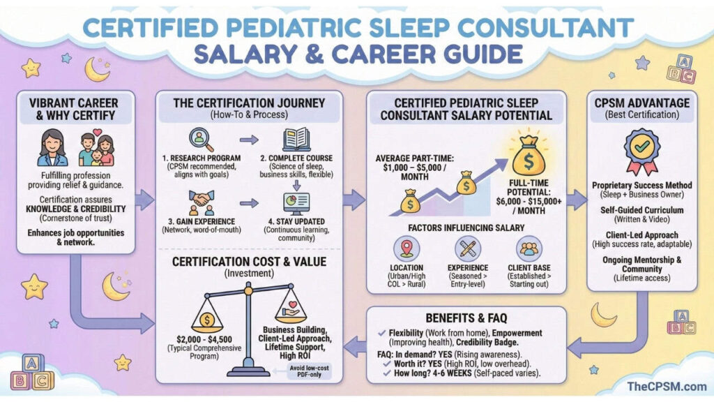 A career as a Certified Pediatric Sleep Consultant offers a blend of personal fulfillment and professional growth. Proper certification is the cornerstone of this career, ensuring that consultants provide the highest quality of care, backed by comprehensive knowledge and practical experience. The potential for a rewarding salary, coupled with the satisfaction of making a meaningful impact on families, makes this career path highly appealing. Center for Pediatric Sleep Management stands out as a leading provider of top-tier certification and support, ensuring that its graduates are well-prepared for success in this field. For those inspired to embark on this rewarding journey, CPSM offers the perfect starting point, and we encourage you to explore our certification program to begin your path to becoming a Certified Pediatric Sleep Consultant. To get started, just click Enroll Now down below.