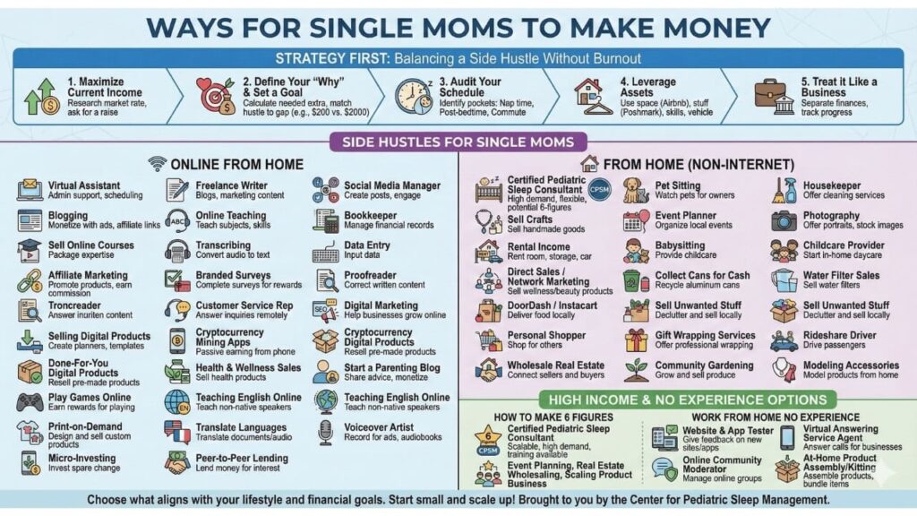 If you’re looking for ways for single moms to make money from home, this is your way to build a flexible, home-based business. If you’re passionate about child development, sleep science, or just love helping other moms, this could be your perfect path. Learn more and enroll at thecpsm.com.